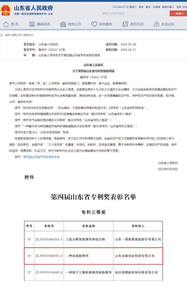 日前,山東省人民政府公布了第四屆山東省專利獎獲獎名單,山東龍港硅業(yè)科技有限公司的發(fā)明專利“一種硅基阻燃劑”被授予山東省專利獎三等獎?!?/p>